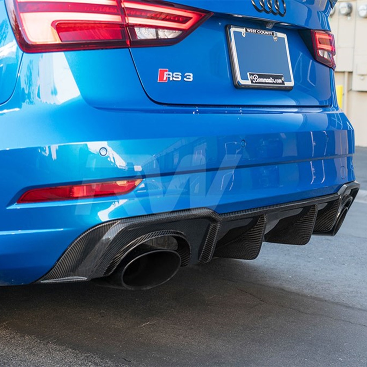 Upgrade your boring OEM diffuser today with our Audi 8V RS3 Carbon Fiber Rear Diffuser. This carbon fiber RS3 diffuser replaces the existing plastic on the lower portion of your rear bumper for a massively improved appearance. Each Audi 8V RS3 CF diffuser is hand crafted with genuine 2×2 carbon fiber and finished with a UV resistant clearcoat. As with all of RW Carbon’s carbon fiber items this RS3 diffuser comes backed by our fitment and quality guarantee. Additionally, each 8V RS3 diffuser ships from our location in Anaheim CA, but prior to shipping each one is quality checked one last time to ensure you receive a great looking product. .If you are looking for your first piece of carbon fiber or your last, this is the perfect look on the Audi RS3.
