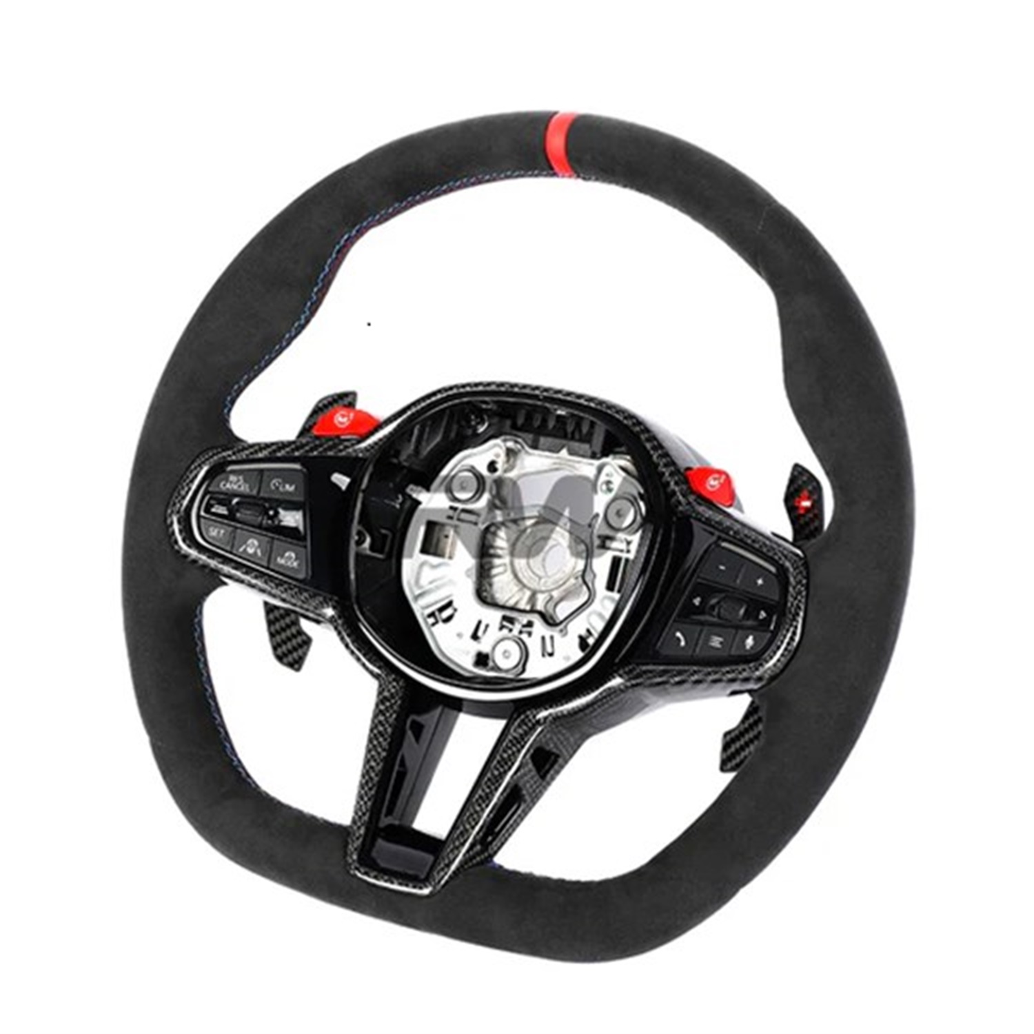 Introducing the BMW G8X LCI Alcantara Carbon Fiber Steering Wheel, designed to elevate your driving experience with its elegant look and feel every time you drive. This steering wheel combines luxurious Alcantara and genuine 2×2 carbon fiber weave, offering a smooth feel and a carbon fiber shine that will complement any other existing carbon fiber interior parts you may have. Upgrade from the common leather grip and feel the difference in your interior. Installation is straightforward, utilizing the OEM steering wheel core, which guarantees proper fitment with every installation. Professional installation is recommended for optimal results. Our steering wheels are specifically made for BMW G8X LCI’s, but if this isn’t the car you own, feel free to explore our wide selection of steering wheel accessories for your BMW model. Contact us today for more information.