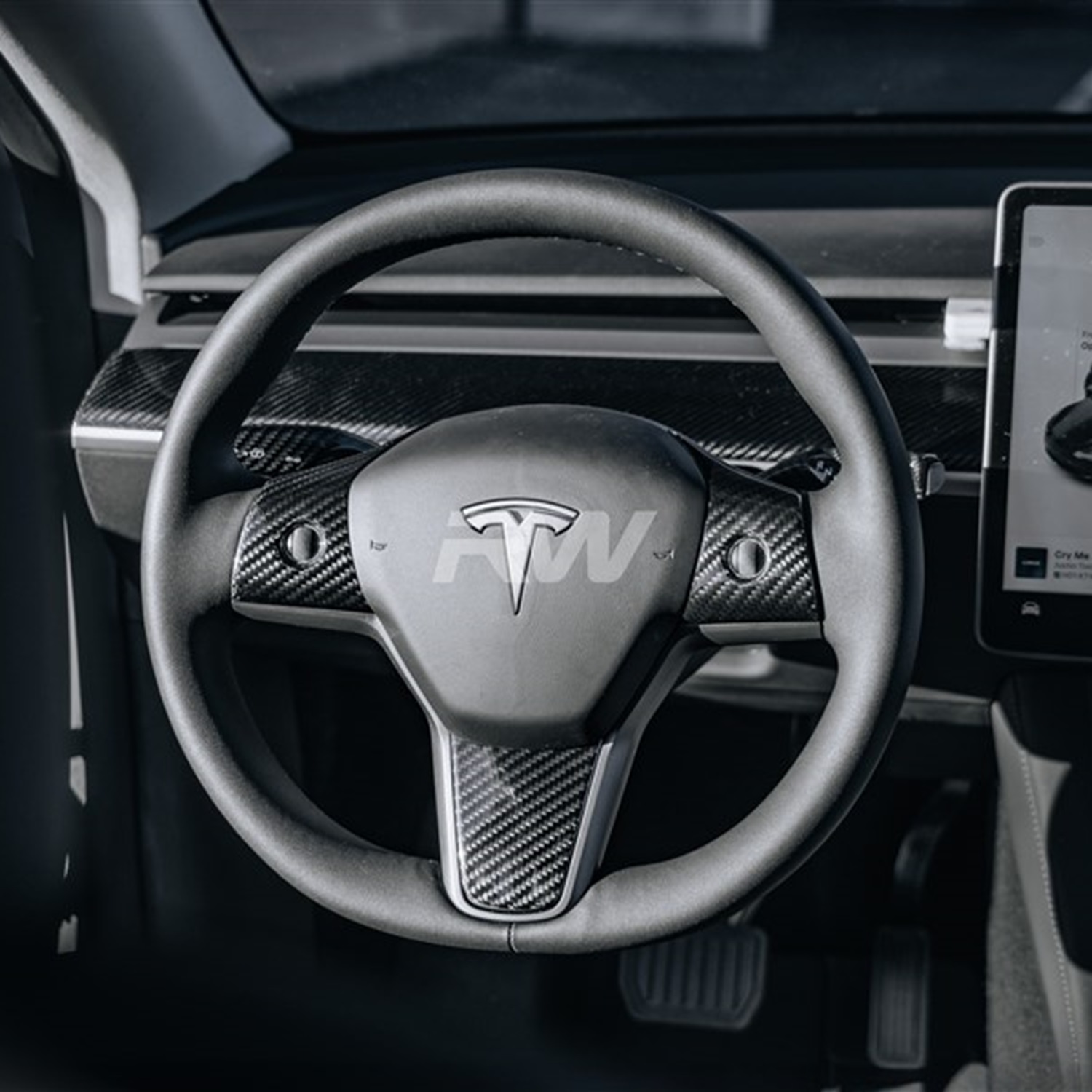 Professional installation is always recommended for RW Carbon’s products including this Tesla Model 3 carbon fiber steering wheel trim. These trim pieces can be installed in about 30 minutes and use 3M tape and promoter.
