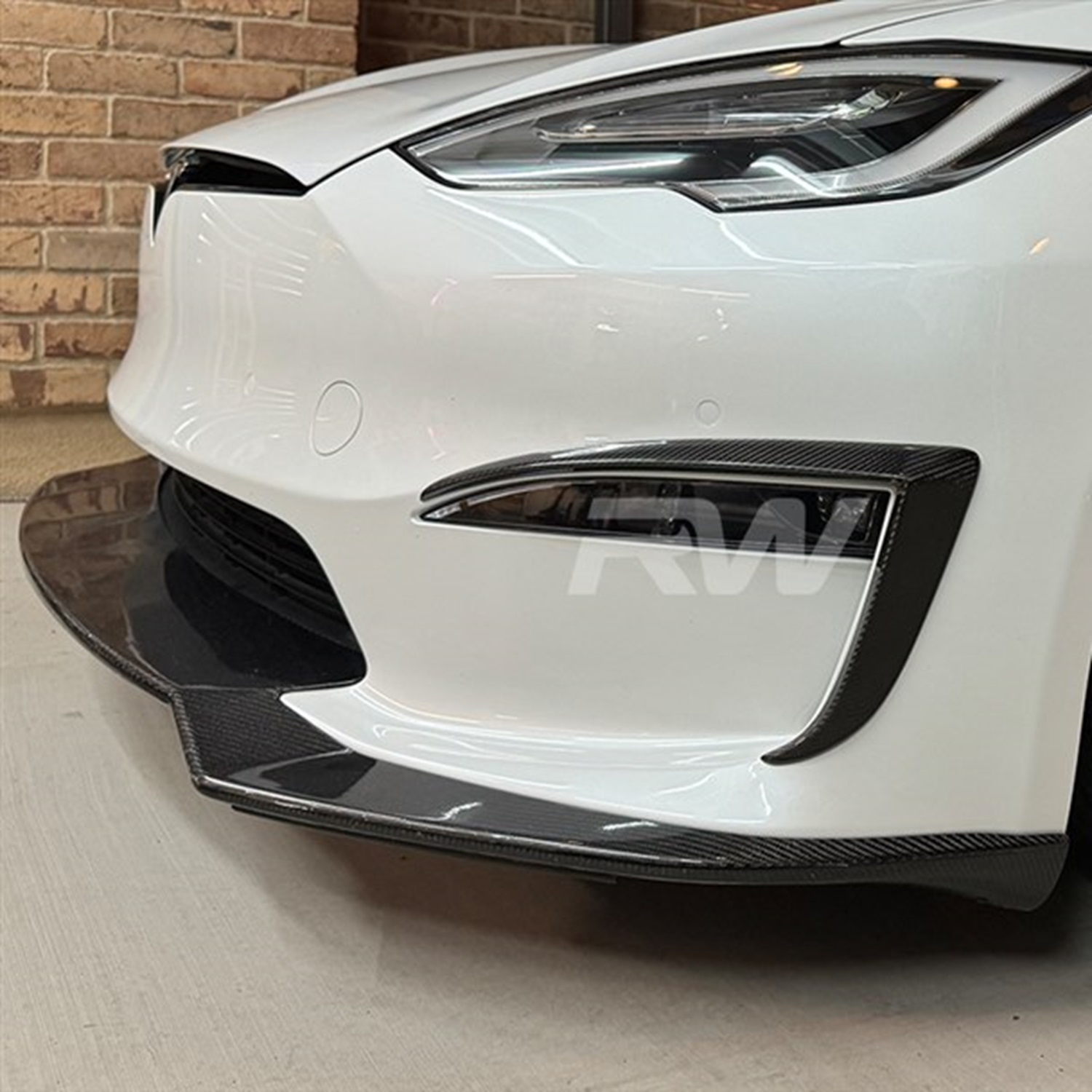 Explore our latest release of RW’s Carbon Fiber Front Upper Splitters customized for the Tesla Model S. Precision-engineered to inject a bold and revolutionary flair into your vehicle’s frontal aesthetics. These upper splitters simply install with 3M tape and are easily removable should you decide to take them off down the road Carbon Fiber Front Upper Splitters customized for the Tesla Model S. We ensure impeccable product fitment through thorough scanning of each designed make and model. Crafted from Genuine 2×2 weave carbon fiber, our splitters provide a sharp, new look that will leave other drivers envious of your Tesla Model S Facelift.